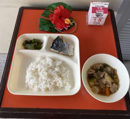 今日の献立は、さごしの塩焼き、豚肉とじゃがいもの煮ものオクラのいためもの、ごはん、牛乳でした。