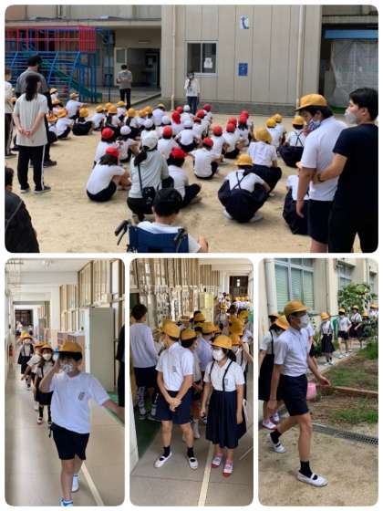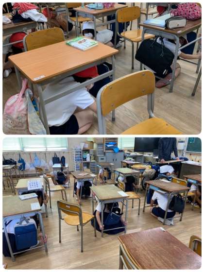 1次避難では、机やいすを使って身を守り、2次避難で運動場に集合しました。子ども達はいつも真剣に避難訓練に取り組んでいます。