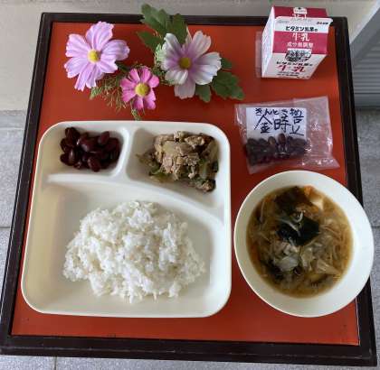 今日の献立は、豚肉の甘辛焼き、みそ汁、金時豆の煮もの、ごはん、牛乳でした。