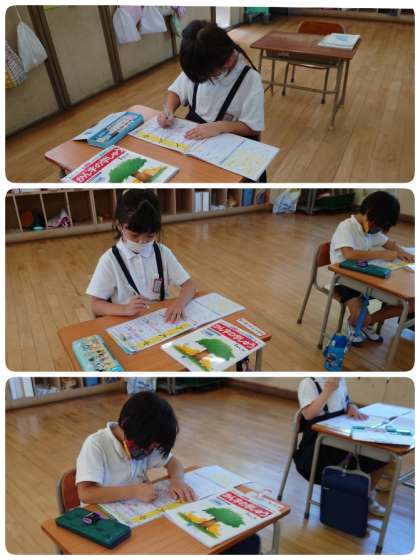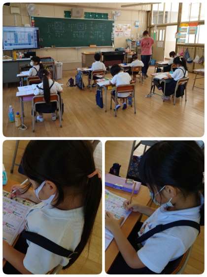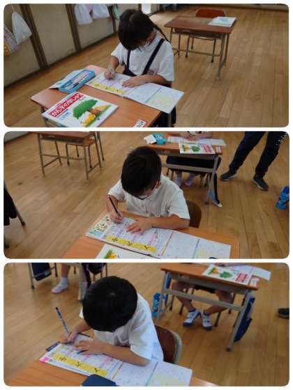2学期に入って、1年生も本格的に漢字の学習が始まりました。今日学習していた漢字は、「中」「大」「入」。1年生の子ども達は、1画1画、書き順を確かめながらしっかり書いていました。「足の裏を全部床につけて、背中を伸ばして書こうね。」と声をかけると、さっと姿勢を正していました。