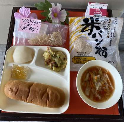 今日の豆乳マカロニグラタン〔米粉〕は、小麦、乳アレルギーの児童が食べることができるよう牛乳、小麦粉は使用せず、豆乳、上新粉(米粉)、米粉のパン粉を使用しています。