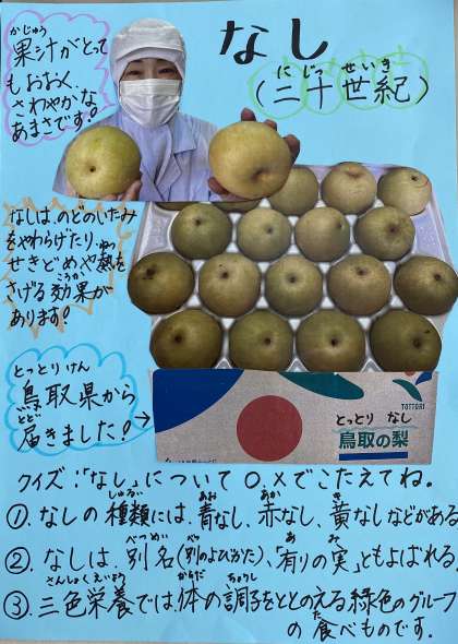 なしの種類は、黄なしはありません。青なしは、今日の給食に出た二十世紀、赤なしは、幸水、豊水などがあります。
