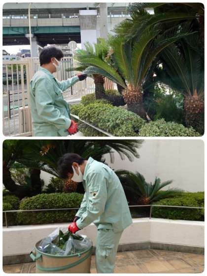 正門前の植え込みの葉っぱを管理作業員さんに剪定してもらいました。