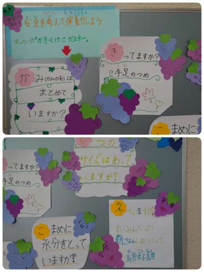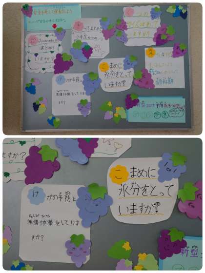 9月の健康生活委員会の掲示のテーマは「安全を考えて運動しよう」でキーワードは「か・き・く・け・こ・だよねー」となっています。