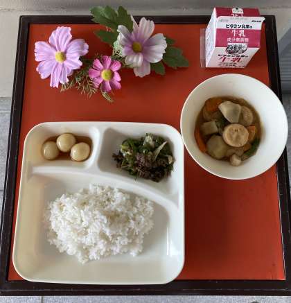 今日の献立は、一口がんもとさといものみそ煮、牛肉と野菜のいためもの、みたらしだんご、ごはん、牛乳でした。