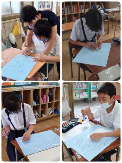 今回の版画は一版多色刷りにするそうです。5年生の子ども達は、いつもていねいに作品づくりに取り組みます。今回も期待大です。