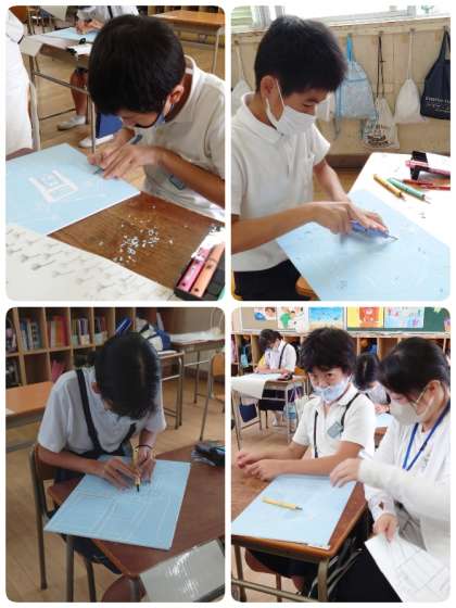5年生が、図画工作の時間に版画をしていました。下絵の線に沿って慎重に彫刻刀を動かして彫り進めていきます。