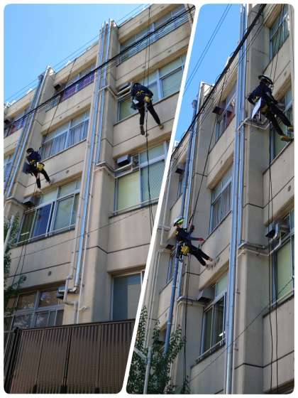 今日は朝から、校舎の壁面調査がありました。屋上からロープで下りていきながら、壁面をたたいて調べていきます。その都度、壁面の状態について記録しながら進んでいきます。下から見上げると、まるでスパイダーマンみたいです。