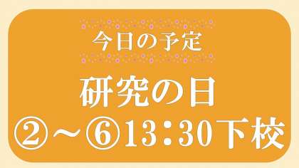 5校時、1年で研究授業を行うため、1年生の下校は14:45ごろになります。ご予定よろしくお願いします。