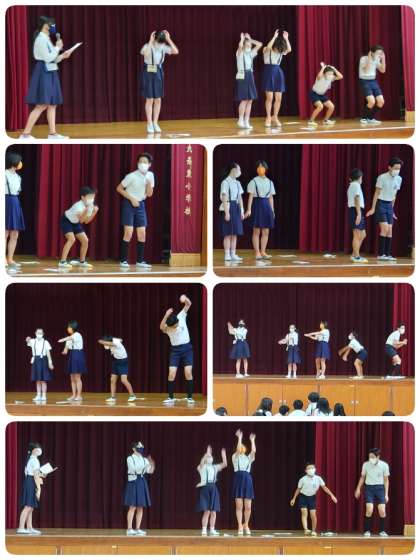 1.ウサギ 2.ネコ 3.ペンギン 4.水泳 5.野球 6.バスケットボール を上手に表現していました。集会委員の子ども達は、みんなの前に立って実に楽しげに動いてくれるので、とても分かりやすいです。今日の児童集会もみんなで仲良く活動できました。