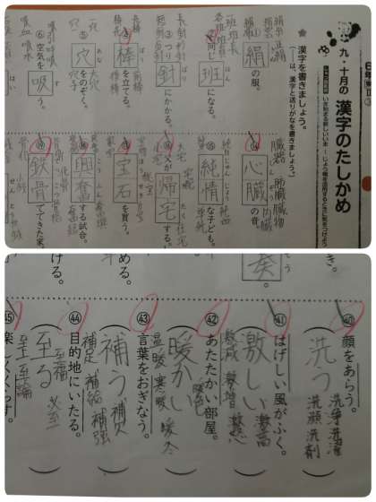 6年生の漢字の学習は素晴らしいです。プリントには、答えを書く以外に、その漢字を使った熟語がびっしりと書かれています。毎回プリントをする時間が早く終わった子ども達は、このように隙間がなくなるぐらいまで、いろいろな熟語を書き込んでいきます。自ら学ぶ姿勢に感心するばかりです。!(^^)!