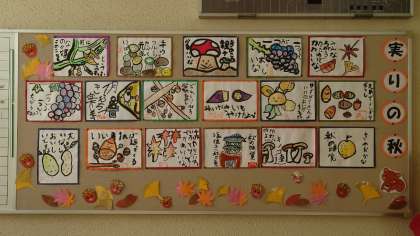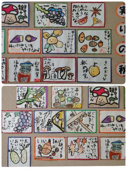 先日の学習参観時に描いた「絵手紙」が、10月の玄関掲示になりました。全員の絵手紙が並ぶといっそうそれぞれの個性があふれて見えます。文字の書き方も色合いもステキな作品ばかりです。