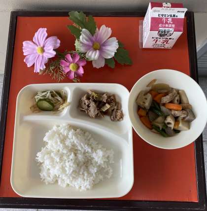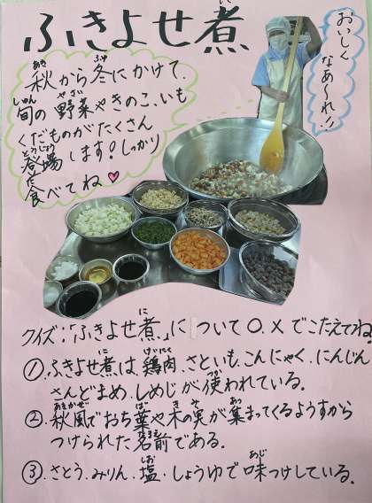 今日の給食のふきよせ煮は、鶏肉、こんにゃく、さといも、にんじん、れんこん、しめじ、さんどまめ、たまねぎをけずりぶしでだしをとり、煮込んでいます。