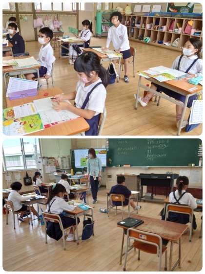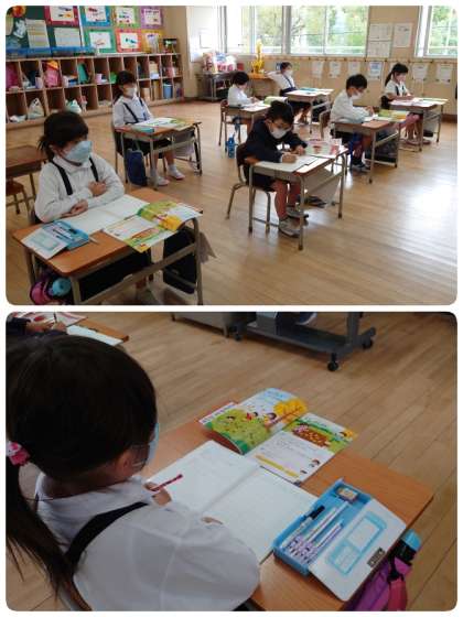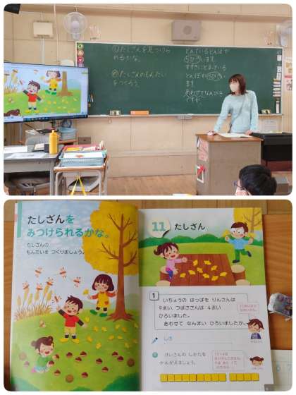 算数の学習で教科書の挿し絵を見ながら問題づくりをしていました。子ども・トンボ・栗・イチョウの葉っぱなどの絵が描いてあります。さて、子ども達はどんな問題を考えたかな?