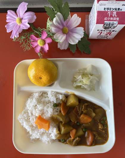 今日の献立は、ポークカレーライス、サワーキャベツ、みかん、牛乳でした。