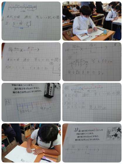 5時間目、6年で研究授業を行いました。算数の学習で、単元は「比 2つの数で割合を表そう」です。