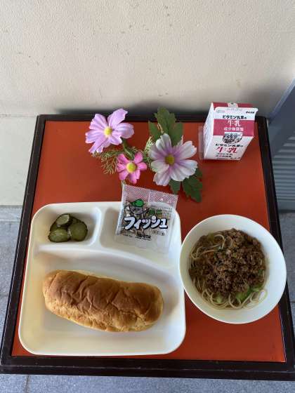 今日の献立は、タンタンめん、きゅうりの甘酢づけ、ミニフィッシュ、おさつパン、牛乳でした。