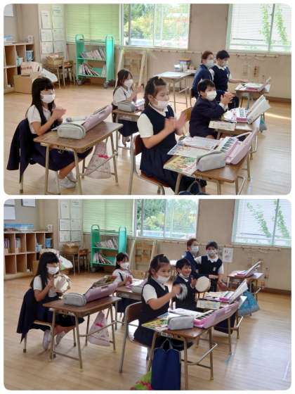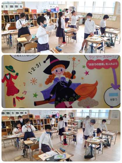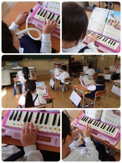 今日の5時間目は、あちこちの教室から音楽が聞こえてきました。1年生は鍵盤ハーモニカで「ひのまる」を演奏していました。2年生は「おまつりの音楽」のリズム打ちをして、打楽器で演奏していました。3年生は「おかしのすきな まほう使い」の歌を楽しそうに歌っていました。1年生はこの後、鍵盤ハーモニカのテストがあるそうで、子ども達は真剣に練習していましたよ。