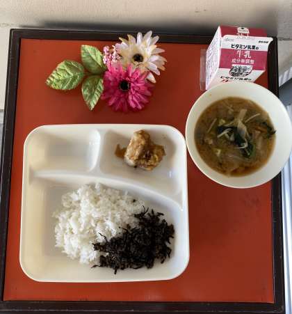 今日の献立は、あかうおのみぞれかけ、みそ汁、牛ひじきそぼろ、ごはん、牛乳でした。