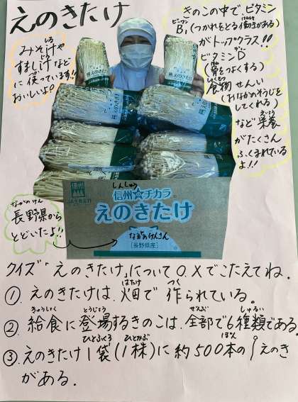 えのきたけは、菌床で栽培されます。給食に登場するきのこは、えのきたけ、しいたけ、まいたけ、しめじ、なめこ、エリンギ、マッシュルームの7種類です。