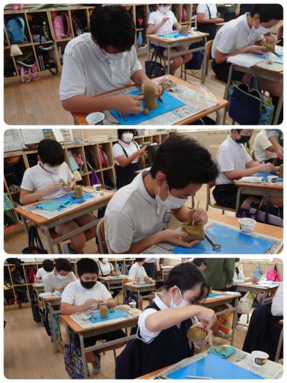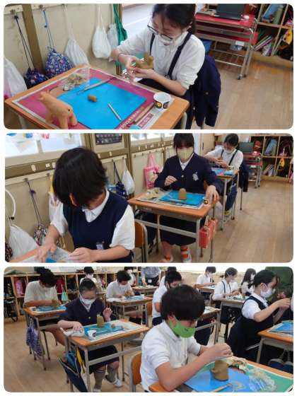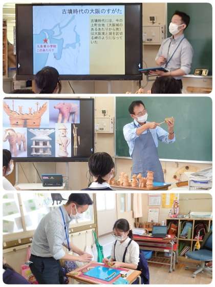 3・4時間目、大阪府立近つ飛鳥博物館の方に来ていただき、はにわ作りをしました。最初に「埴輪」についていろいろ教えていただきました。お話がとても分かりやすくて、子ども達は身を乗り出すようにプレゼンを見ながら熱心に聞いていました。