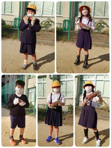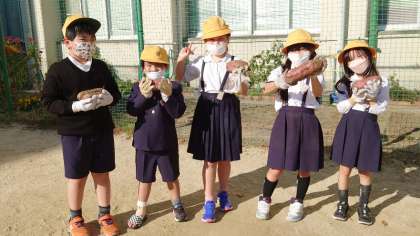 2年生が育ててきたサツマイモを収穫しました。大豊作です。すごく大きいおいもが土の中からゴロゴロ出てきました。子ども達も大喜び!!