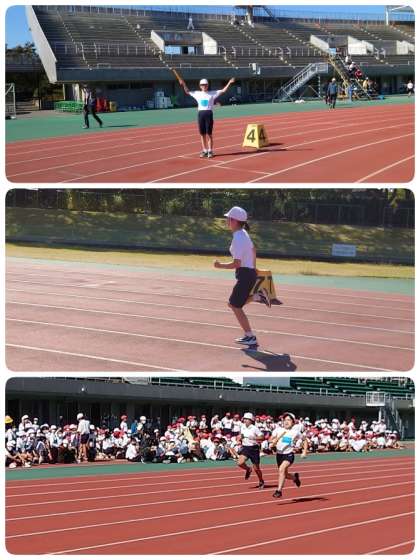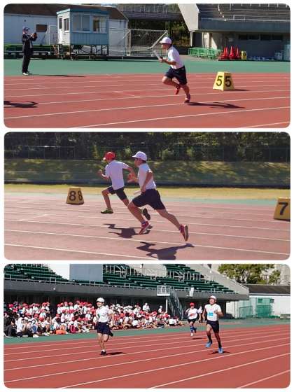 100m走、800m走に続いて、最後の種目、400mリレーの様子です。全力を出し切って走り抜けました。応援もすごかったです。
