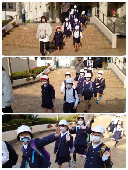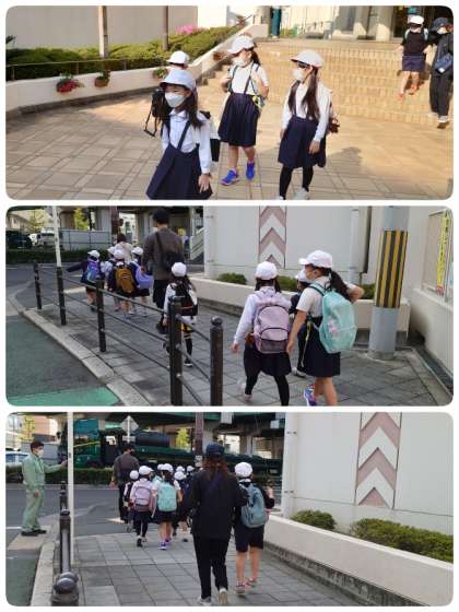 1・2年生が、靭公園・大阪市立科学館に向けて学校を出発しました。