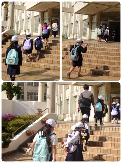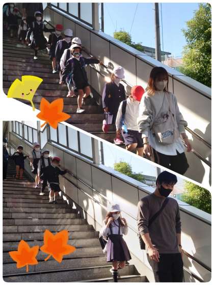 ただいまです。元気いっぱいで学校に到着しました。色づいた葉っぱやドングリなど、いっぱい秋を見つけることができたそうですよ。