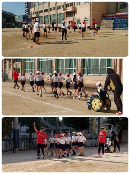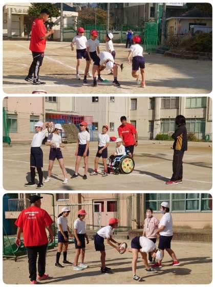 NTTドコモレッドハリケーンズ大阪の栗原大介選手、原山光正選手、安田司選手が九条東小学校の5・6年生に、ラグビーを教えに来てくれました。選手のみなさんは、とても大きくてかっこよくて、子ども達もわくわくしています。