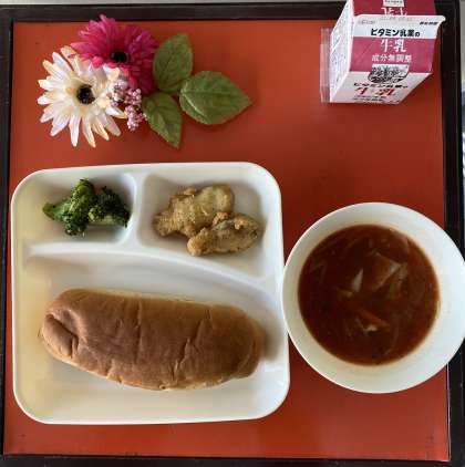 今日の献立は、白身魚のフリッター、ミネストローネ、ブロッコリーのサラダ、黒糖パン、牛乳でした。