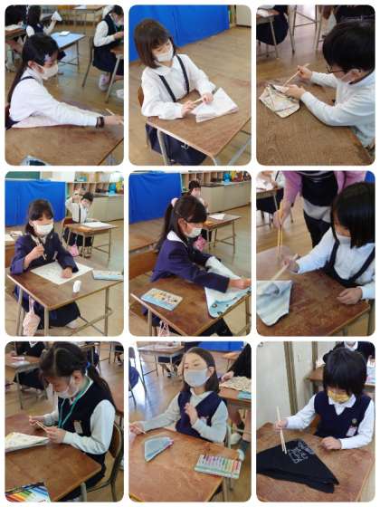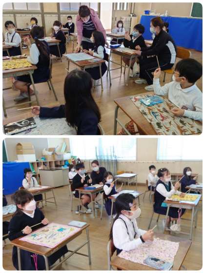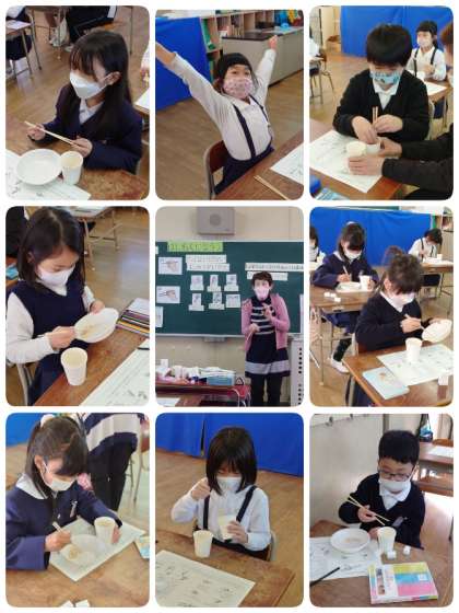 今日は、1・2年一緒に「はし名人になろう」の学習をしました。実際にお箸を使って、箸の持ち方を教えてもらいました。最初はナフキンの端を持ってたたむ練習です。次にスポンジつかみで練習。それから豆つかみをしました。1回目は大豆を10個、2回目は白花豆を20個に挑戦しました。子ども達は真剣です。最後の豆を移動したら大満足の表情で、思わず「できた!やったぁ!!」と喜んでいました。みんな中々上手につかんでいましたよ。