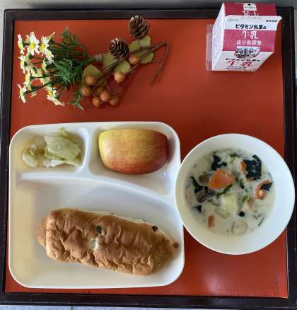 今日の献立は、きのこのクリームシチュー、キャベツのピクルス、りんご、レーズンパン、牛乳でした。