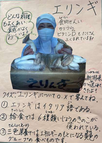 エリンギはきのこの仲間で、三食栄養では、体の調子を整える緑色のグループの食べものです。