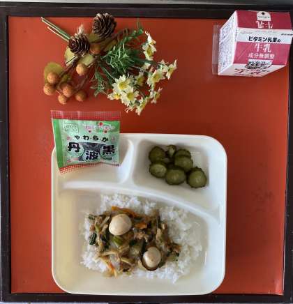 今日の献立は、中華丼、きゅうりのピリ辛あえ、ソフト黒豆、牛乳でした。