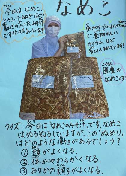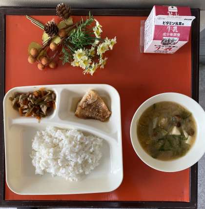 今日の献立は、あかうおのしょうゆだれかけ、なめこのみそ汁、きんぴらごぼう、ごはん、牛乳です。