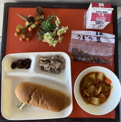 今日の献立は、豚肉のガーリック焼き、ケチャップ煮、うずら豆のグラッセ、コッペパン、バター、牛乳でした。