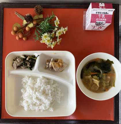 今日の献立は、豚肉のおろしじょうゆかけ、みそ汁、こまつなのいためもの、ごはん、牛乳でした。
