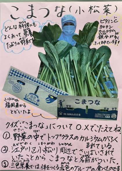 こまつなは、野菜なので三食栄養では、体の調子を整える緑色のグループの食べものです。