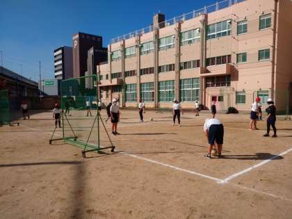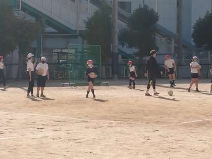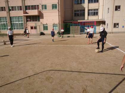 ラインサッカーで、パスの練習をしています。足でボールを操るのは難しいですが、がんばっています。