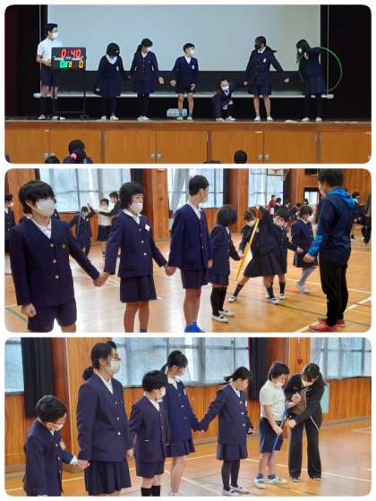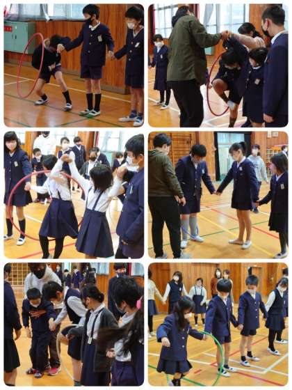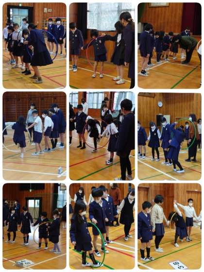 まず、たてわり班で1列になります。並ぶ順番は班で考えました。手をつないでフープを順に送っていきます。制限時間内に全員でリレーができたらゴールです。1回戦の制限時間は長めで、前から後ろまでリレーができればOKでしたが、段々制限時間間短くなり、片道でなく往復リレーになっていきました。子ども達も何回かするとコツをつかんできて上手にリレーができるようになってきました。制限時間内にゴールできるがドキドキワクワク。班のみんなでがんばっているお友達を見守っていました。ゴールできた班にはたくさん拍手が送られていました。楽しい集会活動になりました。