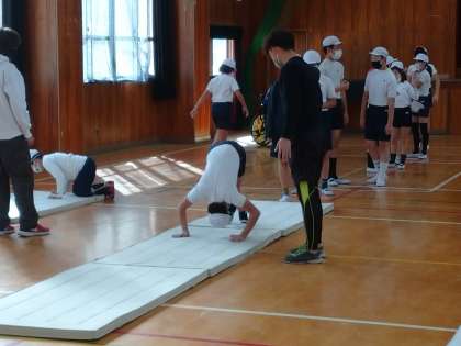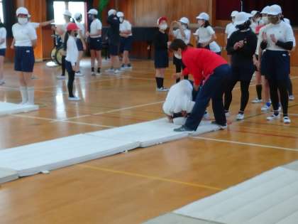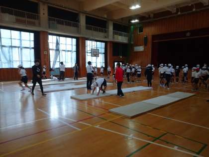 今日は、西区役所から体育授業のインストラクターの方がこられました。マット運動で前転 後転 開きゃく前転 後転などを教えて頂きました。