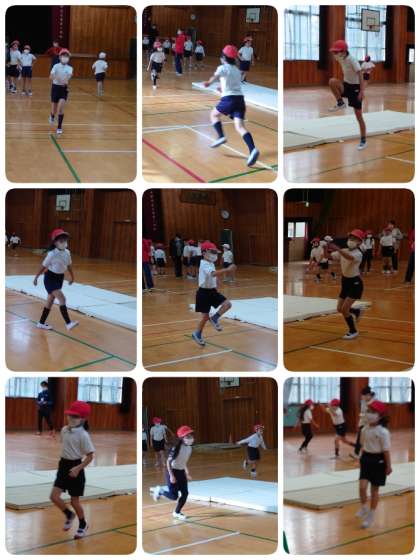 まずは体ほぐしの運動です。走ったり、スキップしたり、大きなスキップをしたりといろんな動きをして体をほぐしました。今日は主に前転と後転を教えてもらいました。手の付き方や体の丸め方など、どうしたらうまく回れるのかコツを教えてもらいました。子ども達は講師の先生が補助してくれるので、くるんと回ることができました。ほめてもらうとますます楽しくなってきて、どんどん練習していました。また体育の時間に練習します。