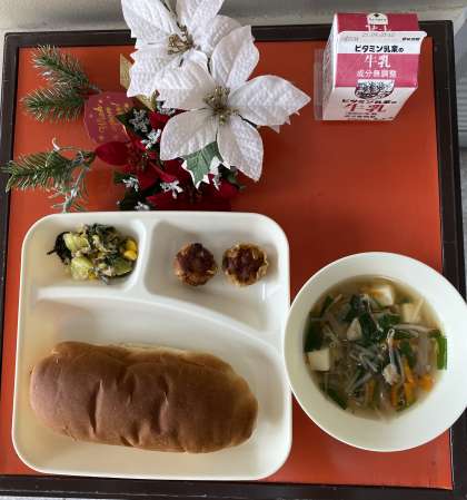 今日の献立は、あげシューマイ、中華スープ、ツナとチンゲンサイのいためもの、黒糖パン、牛乳でした。