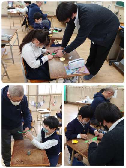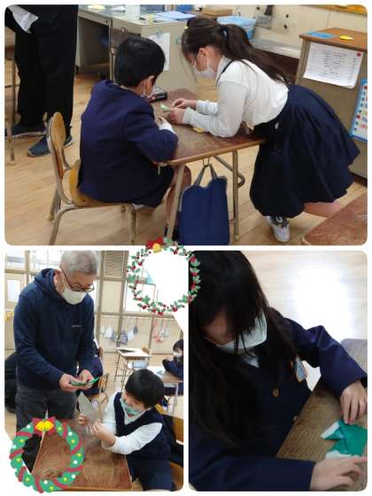 サツマイモのツルで作ったリースの飾りを折り紙で作りました。今日は、ベルとヒイラギの葉っぱを折りました。折り方がよく分かる動画を見て、ひとつひとつ確認しながら折っていました。たくさん飾りを作ってステキなリースに仕上げたいと思います。お楽しみに!