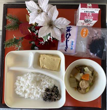 今日の献立は、卵どうふ、一口がんもと野菜の煮もの、魚ひじきそぼろ、ごはん、牛乳でした。