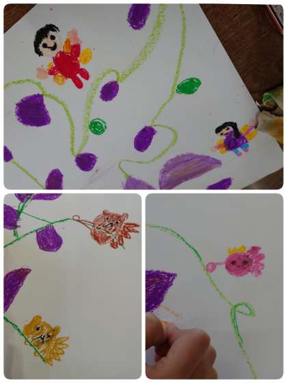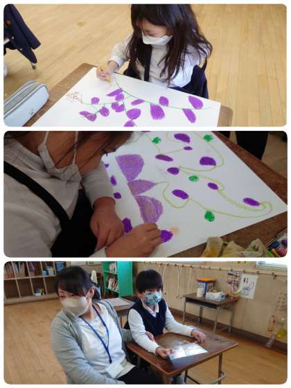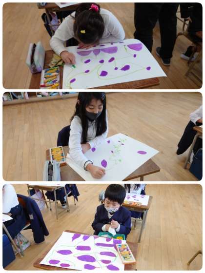 2年生の子ども達が、サツマイモと一緒にちっちゃな妖精を描いていました。サツマイモの大きさや葉っぱの描き方を工夫して、サツマイモの楽園でいろんな生き物の妖精が遊んでいる想像の世界です。子ども達は、お気に入りの妖精を次々と描いて楽しんでいました。