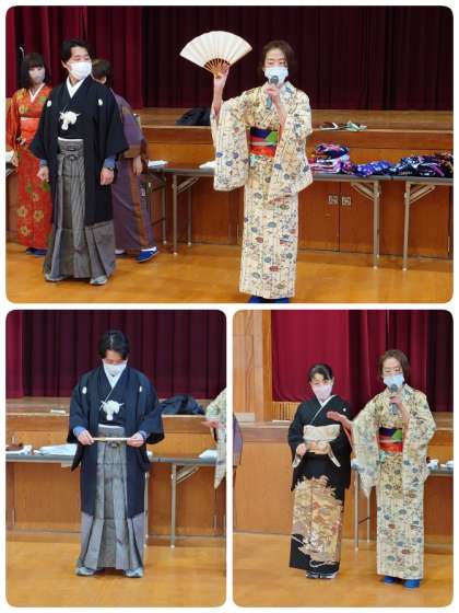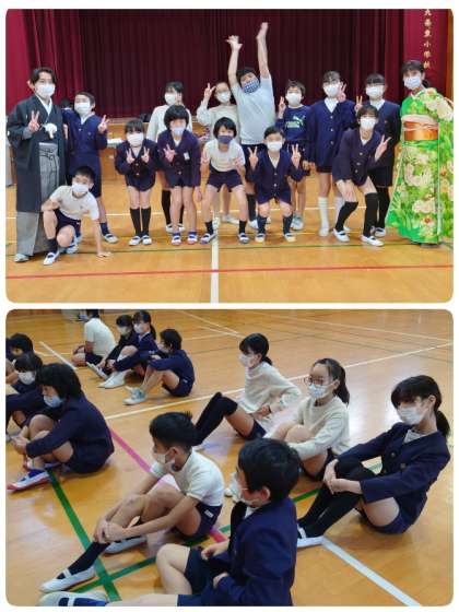 講師の先生方の手際が素晴らしく、見る見るうちに担任の先生達は大変身。子ども達も喜んでいました。それから、家紋と扇子の使い方や意味も教えてもらいました。