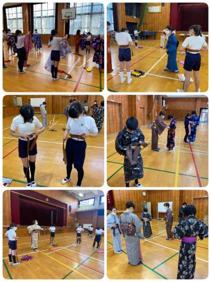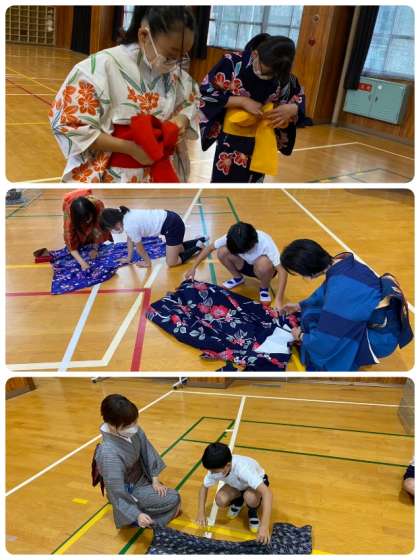 いよいよ子ども達の着付け体験開始です。子ども達は、先生の話を聞いて、たくさん手伝ってもらって、全員ゆかたを着ることができました。みんなとってもうれしそうです。最後にはずっと着ていたいという子まで出てきました。すごく楽しかったと話してくれました。