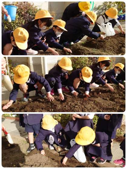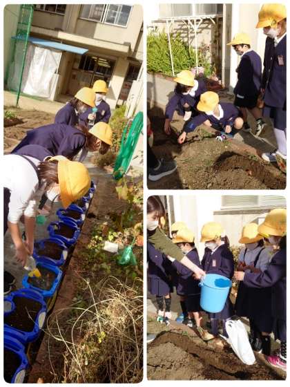 次に、学習園にチューリップとスイセンの球根を植えました。間隔をあけながら、みんなで協力して順番に球根を並べていきました。最後にまた土をかけて、水やりもしました。これからきれいな花が咲くようにお世話をしていきます。